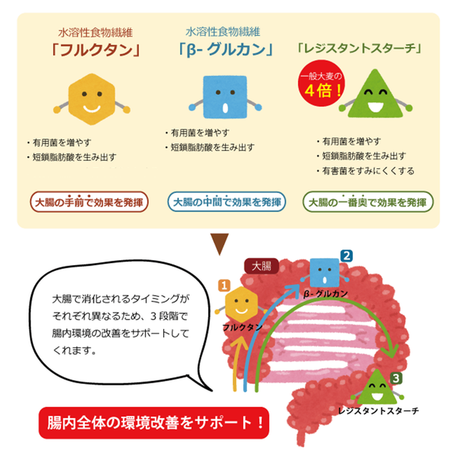 ●性質の異なる3つの食物繊維が有用菌を増やして腸の奥までケアしてくれる