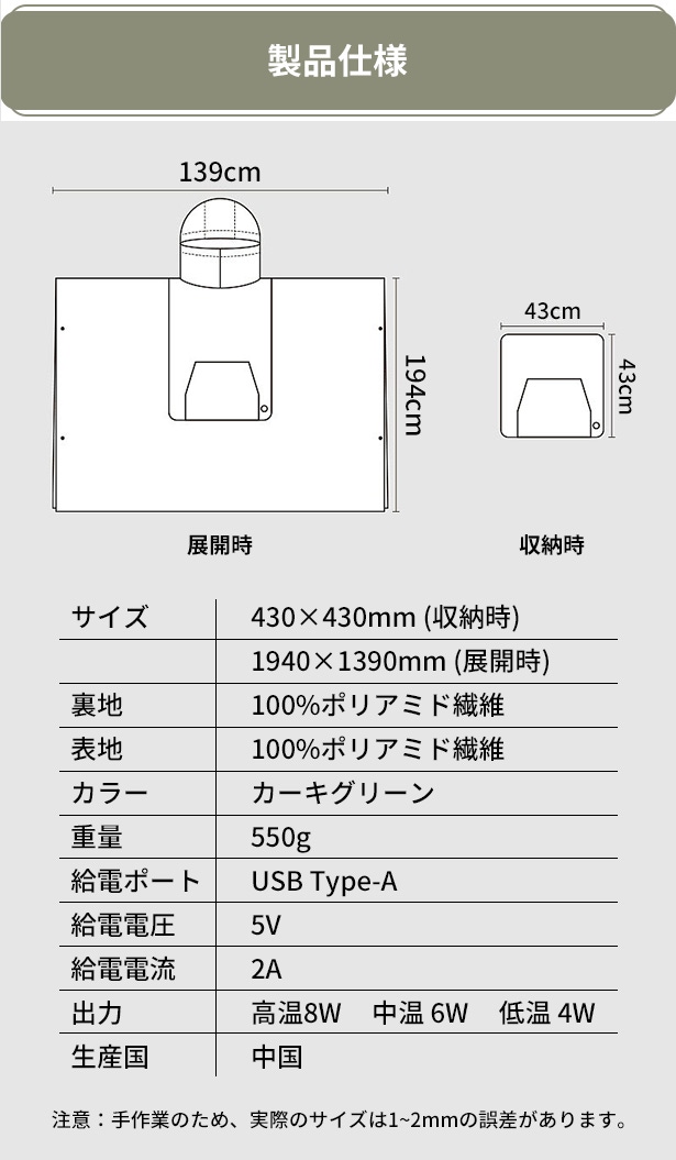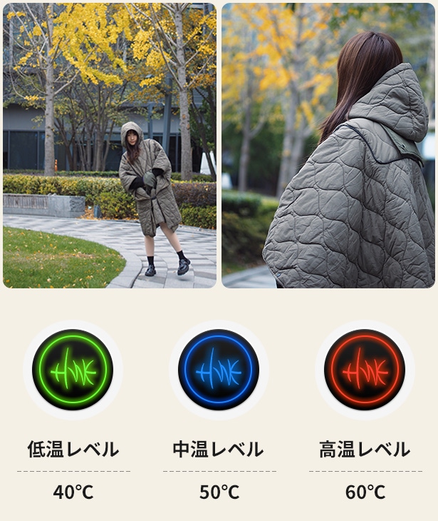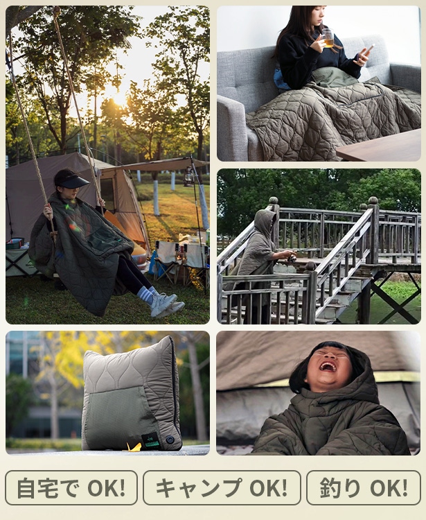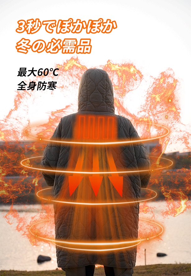 グラフェンカーボンナノチューブシート技術を採用し、モバイルバッテリーに接続してボタンを押すと3秒でぽかぽか。おうちでブランケットとして、または冬のキャンプや釣りでケープやポンチョとしてお使いいただくこともできます。