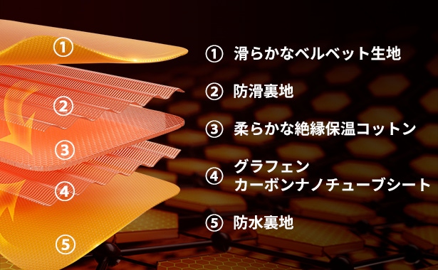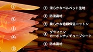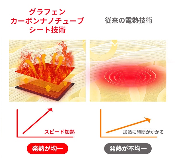 - グラフェンカーボンナノチューブシート技術採用、3秒でスピード発熱!