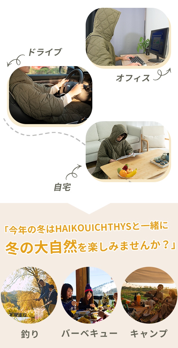 発熱ブランケットHAIKOUICHTHYSは、アウトドアレジャーが好きな方におすすめの革新的な商品です。ブランケット、抱き枕、ケープ、ポンチョの4パターンで使用でき、冬のキャンプや釣りをより快適にするお手伝いをします。また、防水・高通気、水洗いも可能、USB給電で便利さがアップしており、アウトドアライフに無限の可能性を与えてくれます。
