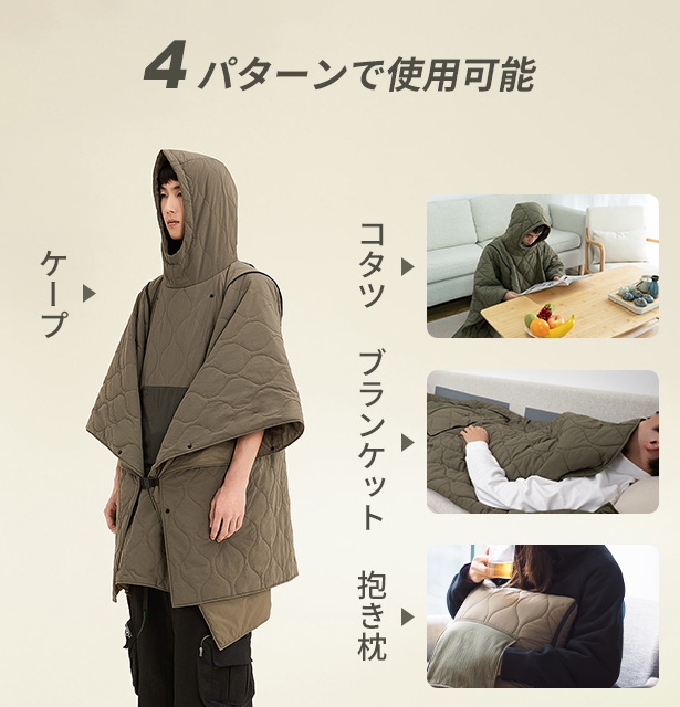 - ブランケット/抱き枕/ケープ/コタツの4パターンで使用可能、場所を取らずに収納できる!