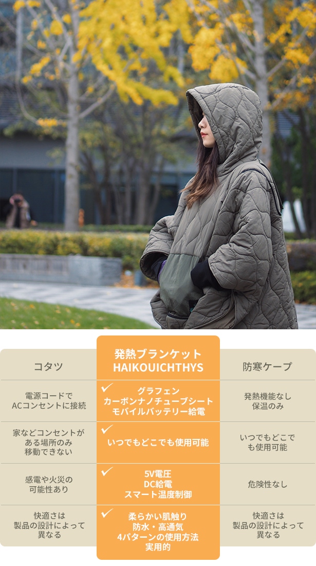 4パターンの使い方ができるHAIKOUICHTHYSがあれば、冬の様々なシーンで快適にお過ごしいただけます。従来のコタツや防寒ケープと性能を比較してみました。