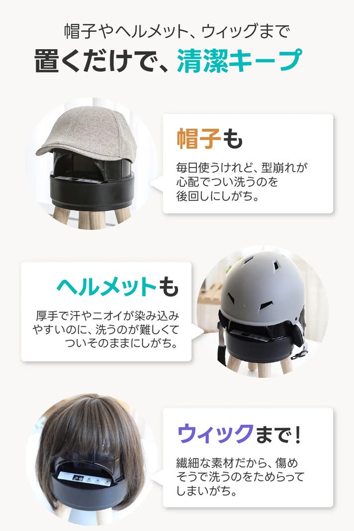 軽い帽子から厚手のヘルメット、繊細なウィッグまで。 型崩れが心配だったり、乾かしにくかったりして、つい洗うのを後回しにしがちです。 その間に、菌やニオイは少しずつ溜まっていきます。