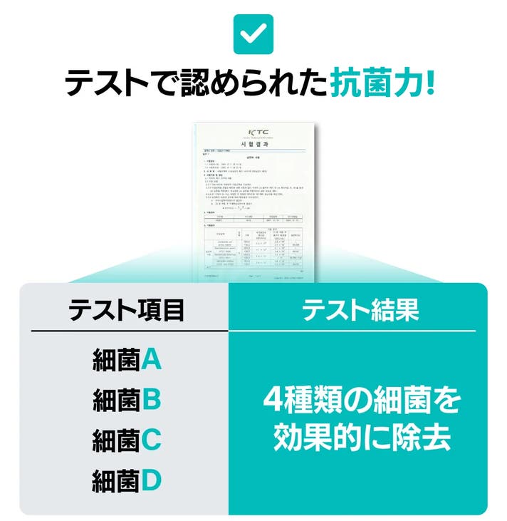 18個のUV-C LEDで、ヘルメット・ウィッグ・帽子を隅々まで徹底抗菌! UV-Cとは、太陽光の中でも特に短い波長域(約254nm)の紫外線を指します。自然界では地表にほとんど届かない光ですが、古くから空調設備や水処理など幅広い分野で活用されてきました。 近年は、オゾンを発生させないタイプのUV-C光源も開発され、日常生活に取り入れやすくなっています。光の力を利用することで、普段見えにくい部分まで清潔で快適な環境づくりをサポートします。 HAIR-Vには18個のLEDライトが搭載されており、ヘルメットやウィッグの内側をしっかりとケアします。 [Hair- V]はテストで優れた抗菌力が認められ、4つの細菌に対して高い抗菌力を誇ります。 ※韓国での試験結果になります。 ※これらの効果はUVランプの効果となります。UVランプが触れた部分のみ抗菌・脱臭効果が得られます。