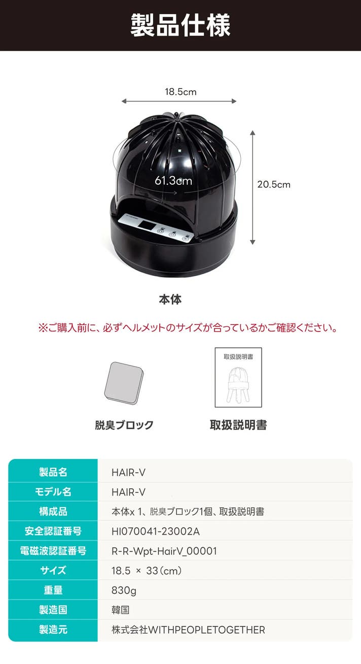 風がすみずみまでスッと通って、内側の奥までしっかりケア。 ムラなく乾かして、毎日清潔に気持ちよく使えます。 いつでも気持ちよく、あなたの大切なものをケアできます。 帽子は約30分、ウィッグは約60分、 ヘルメットは90分でスピーディーに乾燥できます。※乾燥時間は弊社のテスト環境に基づく目安であり、ご使用の製品の素材や厚さによって前後する場合があります。 一般的な乾燥機に使われるACモーターと比べ、消費電力を抑えながらも、高い風量を実現するDCモーターファンを搭載。 高電圧駆動と高品質パーツにより、強力な風を安定して送り、乾燥時間をさらに短縮しました。 難燃素材のファンを採用し、利便性の両立も実現しています。 毎日使うものだからこそ、風の届き方にこだわりました。 50℃の温風がすみずみまで行き渡り、気になる湿気やニオイもすっきりオフ。 帽子やウィッグも、いつでも心地よく整います。 HAIR-Vは、やさしい温風で、帽子やウィッグを清潔に保ちながら快適に乾燥します。 HAIR-Vは、熱によるダメージや型崩れの心配がない最適温度50℃で、帽子やウィッグを素早くかつ効果的に乾燥させます。効果的な抗菌・乾燥システムにより、形を美しくキープすることができます。 直感的なタッチパネルで、UV抗菌・乾燥モードを自由に選択。 オートモードなら、最適なタイミングで抗菌・乾燥を自動制御。 終了時間もディスプレイに表示され、いつでも状況がひと目で分かります。 Hair-Vは、ヘルメットやウィッグが置かれているときのみ作動する感知センサーを搭載しており、より安心してご使用いただけます。 さらに、HAIR-VのアダプターはPSE認証済み。安全性と利便性を兼ね備えているので、日常的に安心してご使用いただけます! 高密度固体ミネラルが雑菌や汗のニオイなど、気になる不快臭をしっかり吸着・除去します。 (ミネラル抗菌脱臭ブロックは、一般的に3ヶ月の使用をおすすめします。) ※アップグレードされた新モデルには、本体背面の電源ボタンは搭載されておりません。 各試験において脱臭および抗菌効果が確認されており、 毎日快適にご使用いただける衛生管理機器です。 ※韓国での試験結果になります。 ※これらの効果はUVランプの効果となります。UVランプが触れた部分のみ抗菌・脱臭効果が得られます。 Hair-Vの消費電力で毎日1時間ずつ使用した場合、 30日基準で約109円で電気代の負担が少ないです。 小さな家電ひとつで、毎日がもっと心地よく変わります。 メーカー保証について Makuakeにてご購入いただいたサポーターの皆様には、製品のお届け日から1年間のメーカー保証をお付けいたします。 本製品【HAIR-V】は家電機器であるため、より安心してご使用いただけるよう、保証期間内において以下の条件を満たす場合、無償での修理または交換対応を承ります。 保証対象:製造上の欠陥、または通常使用におけるハードウェアの不具合 なお、保証を受ける際には、ご購入履歴や製品のシリアル番号等を確認させていただく場合がございます。詳細は製品に同梱の保証書、またはサポート窓口までお問い合わせください。 ヘアブイをもっとスマートにお使いいただけるよう、 どんな空間にもなじむ天然木脚スタンド(4本セット)を別途ご購入いただけます。 製品の高さが上がることで、ウィッグのケアや設置がより快適になります。 Q1. どんな帽子やヘルメットに使えますか? Q2. 使用後はどれくらいで乾燥・抗菌が完了しますか? Q3. UV抗菌は安全ですか? Q4. ミネラルブロックの交換は必要ですか? Q5. 電気代はどれくらいかかりますか? Q6. LEDを目で見ても大丈夫ですか? Q8. 製品本体の背面に電源ボタンがあると聞きましたが、届いた製品にはありません。違いは何ですか? 毎日のように使う帽子やヘルメット、そしてウィッグ。 おしゃれのため、仕事のため、自分らしさのために、 毎日かぶる人も少なくありません。 しかし、そんな “肌に直接触れるもの” を、 私たちはどれくらい清潔に保てているでしょうか? WITHPEOPLE TOGETHERは、そんな疑問からスタートしました。 使用頻度は高いのに、洗いにくく、放っておくとニオイや雑菌の原因にもなる、 そんな「見落としがちな衛生リスク」を、技術の力で解決したいと考えたのです。 特にヘルメットや帽子、ウィッグのように、 形が崩れやすいものは、洗い方や乾かし方を間違えると、 かえって傷みやすくなります。 こうして誕生した HAIR-V(ヘアブイ) は、ただ乾かすだけでなく、 UV-C抗菌や抗菌・脱臭機能も備えた、 毎日の暮らしに寄り添うケアルーチンです。 手軽に、そして快適に、日々の衛生管理をサポートします。 肌に直接触れるものだから、 ちょっとしたケアにも気をつかいたい。 見えないニオイや菌まで、しっかりと対策できる。 そんな日常のために、WITHPEOPLE TOGETHERは製品をつくっています。 本製品は韓国よりの配送となります。日本国内では佐川急便を通じてサポーターの方にお届けします。配