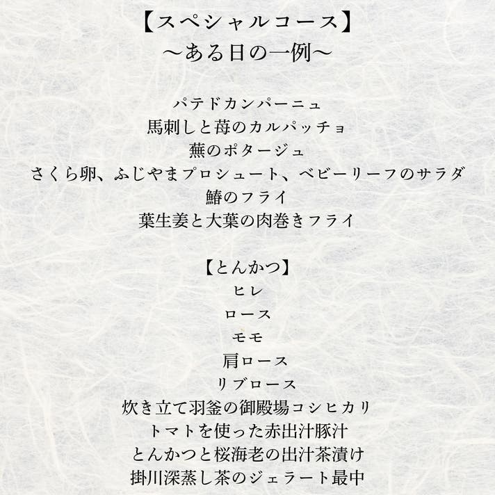 「とんかつ 乃ぐち」より受け継ぐ進化系とんかつの技術と御殿場が誇る食材、水質を活かしたスペシャルコースをリターンとしてご用意いたしました。