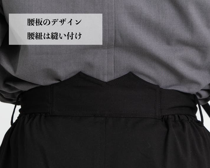 着付け不要。背の腰板から出る紐はパンツに縫い付け済みで、結ぶだけで自然な袴スタイルに。