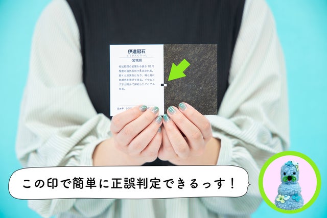 取札には文字情報や数字は一切ない、石材の魅力がこれでもかとわかる激ムズ仕様です!かるたの正誤判定は割り印のような棒線「同じ石チェッカー」を使います。
