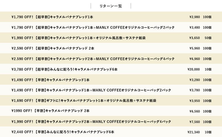 Makuakeでしか買えない"キャラメルバナナブレット"と福岡を代表するMANLY COFFEEさんのオリジナルブレンドのコーヒーバッグ2個がセットになったお得なセットです!