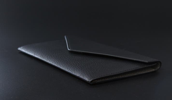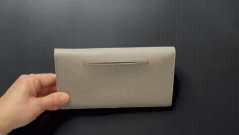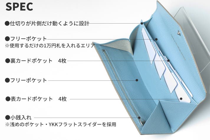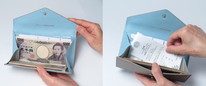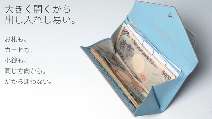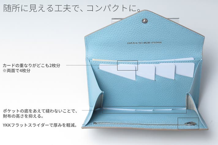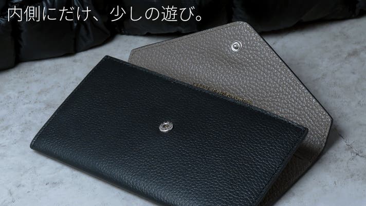 - 封筒のように薄いフラット構造。長財布の安心感を保ちつつ、無駄な厚みを削ぎ落としました。