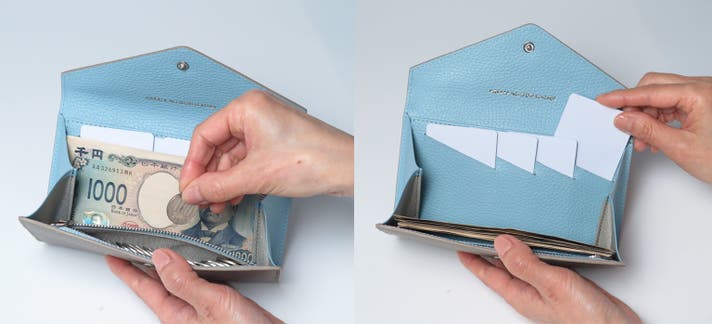 カードやお札の出し入れがしやすいように、仕切りの片側が動きます。
