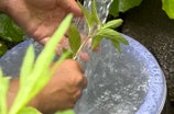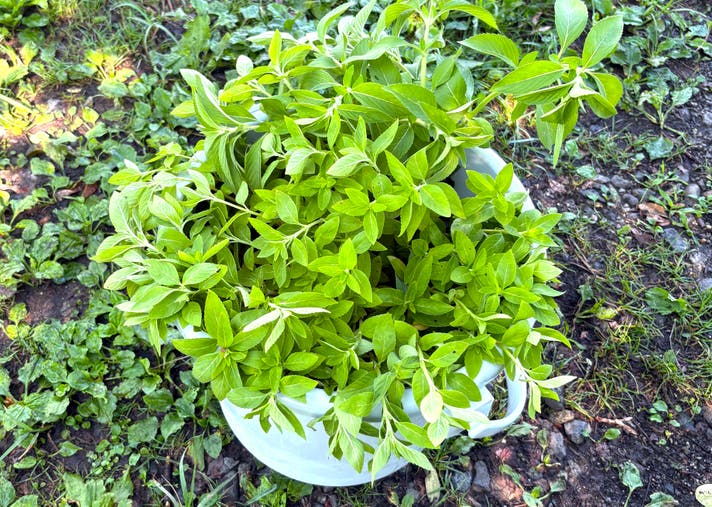 ハーブは摘んだ瞬間から「発酵」が始まり、しなってきます。これを緩和させるために摘んだ和ハッカをすぐに水を張ったバケツに入れます。