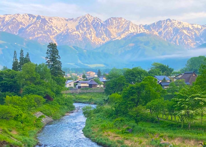 そして遅い春がやってくると雪の下でずっと待ち続けていた草花が一斉に芽吹き、さらに山のみずみずしい新緑も美しく輝きます。そして田畑には北アルプスを源流とする清水が流れ、水を張った田んぼには見事に北アルプスの日の出から夕焼けまでが映し出されます。