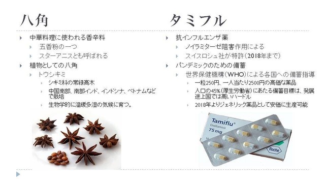 タミフルは現在スイスの製薬会社ロシュが特許を持つため大変高価な薬となっています。しかし、2018年にはこの特許も切れ、とある高度な技術力を持つ日本の製薬会社はジェネリック薬としてより安価に生産、販売する予定です。