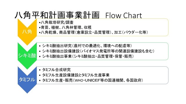 「八角平和計画」は香辛料で知られている「八角」を、今明るい話題で注目され「最後のフロンティア」と呼ばれる「ミャンマー」で育て、「八角」からパンデミック災害で知られる「インフルエンザ」の特効薬「タミフル」を生産し、世界の、アジアの、日本の安全と平和に貢献しようというプロジェクトです。