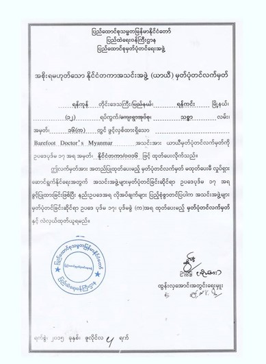 ゴールデンウィーク明けからはじまった本プロジェクトも、おかげさまで6月には目標金額を達成させて頂きました!この間に、ノーベル平和賞受賞者のムハンマド・ユヌス博士に当プロジェクトへの支持をいただきました。そしてミャンマーでの実施NGO法人である「Barefoot Doctors Myanmar」も仮登録も終了しました!