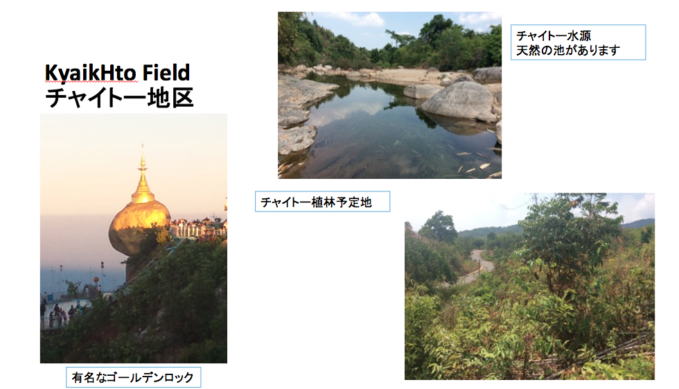 植樹予定地はゴールデンロックで有名なKyaiktiyo Pagodaの麓と、新首都ネピドーとヤンゴンを結ぶ高速道路の途中にあるDaMinGweです。少数民族であるモン族地域にあり、ミャンマー仏教の象徴であるKyaiktiyo Pagodaの麓での八角平和計画の推進は、ミャンマー全土にプロジェクトの心を伝えることができます。ストレッチゴールとして200%達成した際はここに植樹していく予定です!