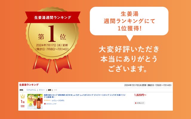 ※楽天市場 生姜湯カテゴリ 週間ランキングにて 2024年7月17日更新