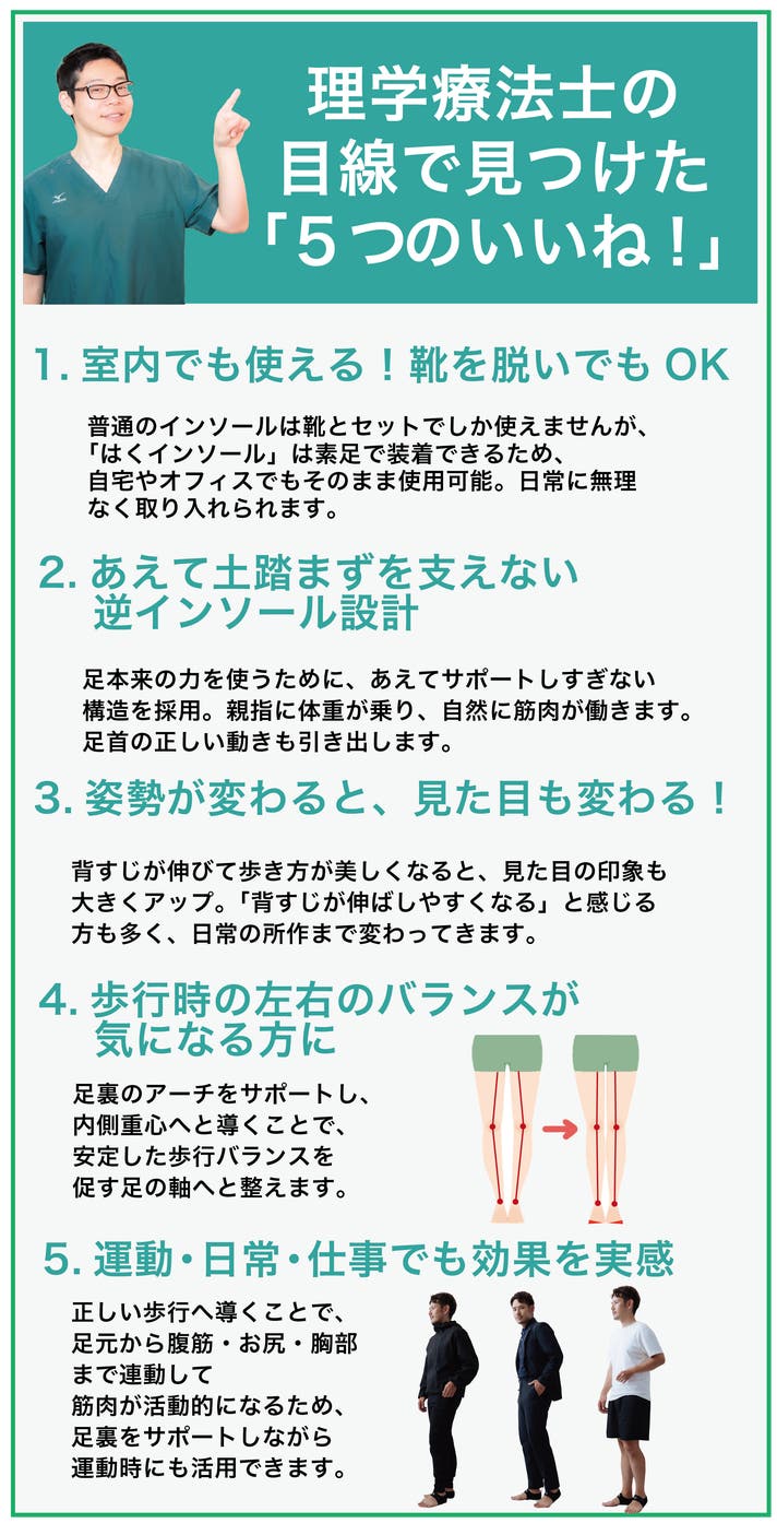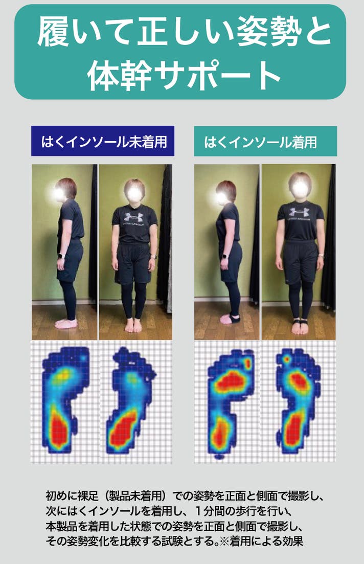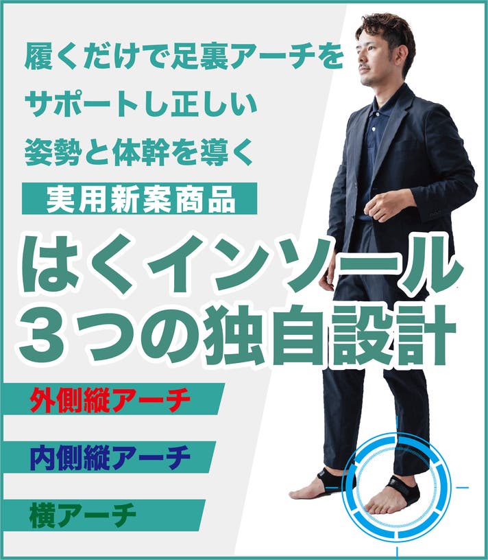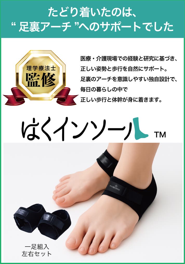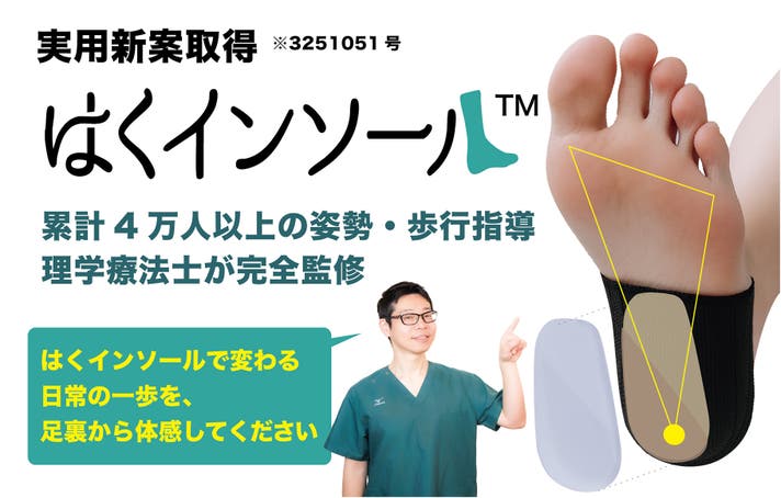 - 実用新案“はくインソール”は2秒装着。歩くだけで足裏アーチを作り足裏から姿勢と体幹をサポート