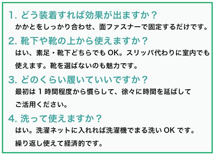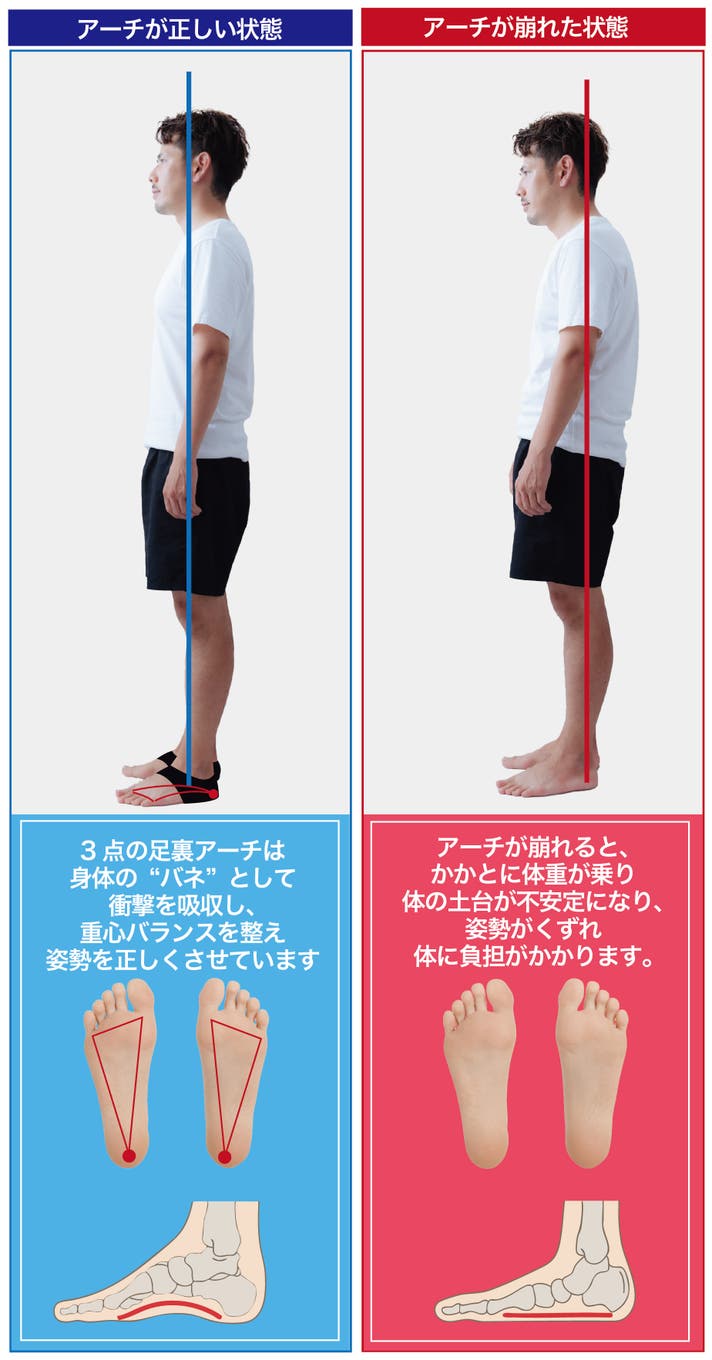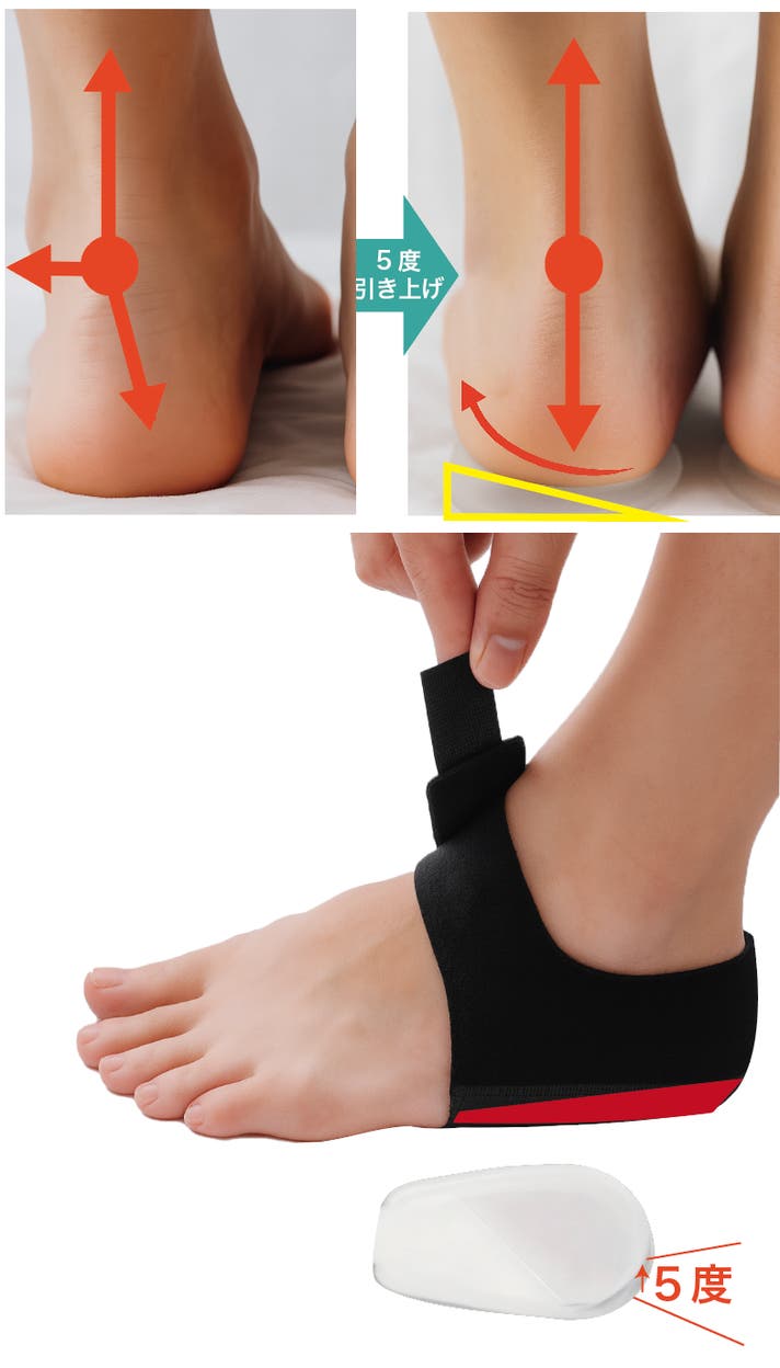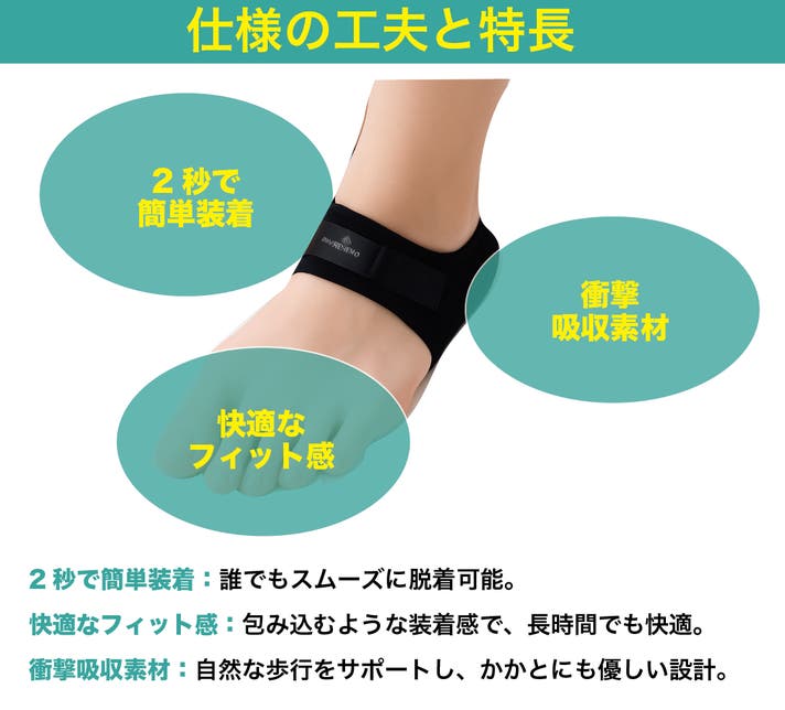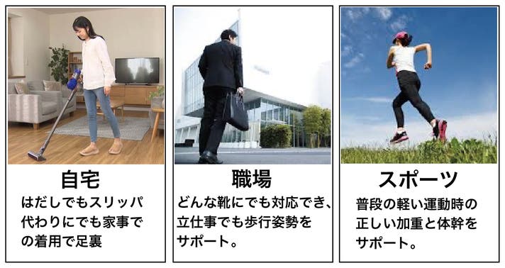 誰でも続けやすい簡単装着習慣で歩行時に足裏アーチをサポートし、筋肉を動かし足元から正しい姿勢を意識しやすくさせます。