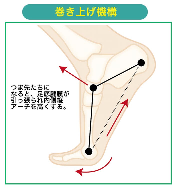 母指球に自然と体重が乗る構造により、ゆりかご歩行ができ足裏からお尻・体幹へと動きが連動。足の悩みの軽減・正しく美しい姿勢へとつながります。これは“ウインドラス機構”が働いたことで歩くたびに正しい足の運びを導きます。