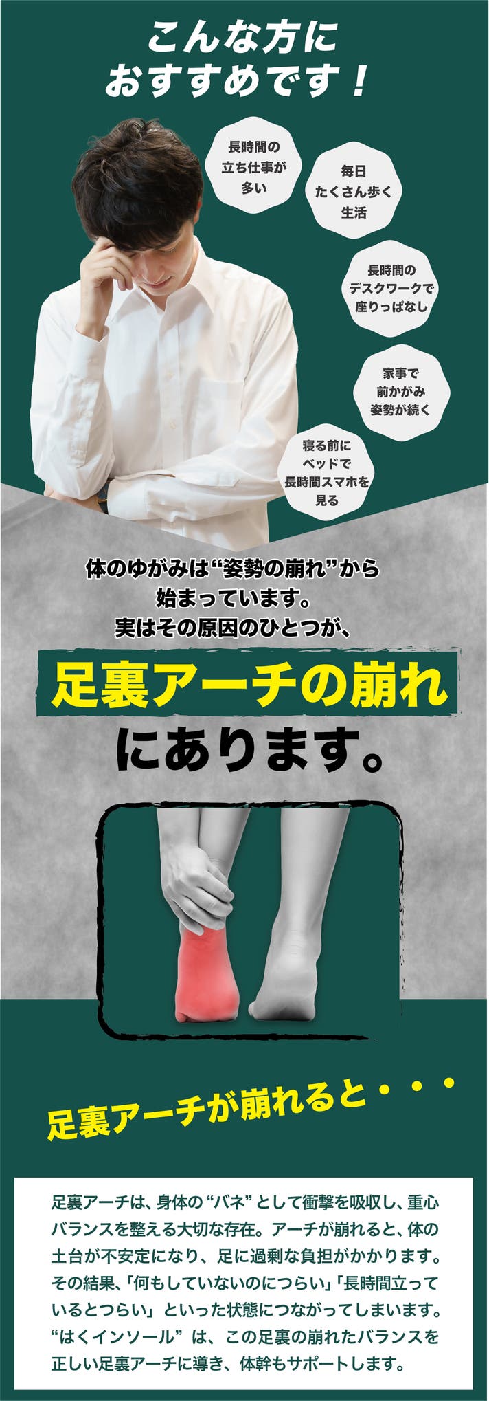 「歩くと足や腰に負担を感じる」「最近、姿勢が崩れてきた」その原因、足裏アーチの崩れのせいかもしれません。国家資格を持つ理学療法士が、20年以上の臨床経験と4万人以上の姿勢・歩行指導をもとに開発したのが“はくインソール”。実用新案の独自構造が、3つの足裏アーチを自然に働かせ、正しい姿勢と歩行をサポート。2秒で装着でき、靴も不要。歩行時に足裏アーチをサポートし、筋肉を動かし足元から正しい姿勢を意識しやすくさせます。