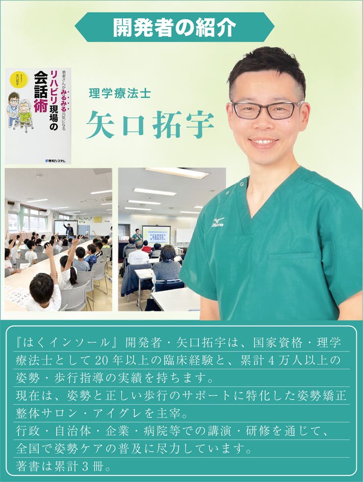 私は理学療法士として、 延べ4万人以上の施術実績があり、姿勢や歩行に悩む多くの方々と向き合ってきました。体への悩みがあると、何事にもやる気が起こらず、気持ちが前向きになれないこともあります。 本当は人生を楽しみたいのに、体への不安感からやりたいことができないのは、とても悲しいことだと思います。私は現場で、そうした悩みを抱えた多くの方を見てきました。 けれど、悩みがなくなると、落ち込んでいた方も前向きに人生を楽しむ姿へと変わっていきます。この「はくインソール」には、そうした“変われるきっかけ”になる要素をぎゅっと詰め込みました。もしあなたが体のことであきらめていることがあるなら、 ぜひこのインソールを手に取って、まずは一歩、踏み出してみてください。「はくインソール」を通じて、歩く楽しさ、外出の喜びを取り戻していただけたら嬉しいです。 ぜひこの機会に、ご自身の足元と体に目を向けてみてください。