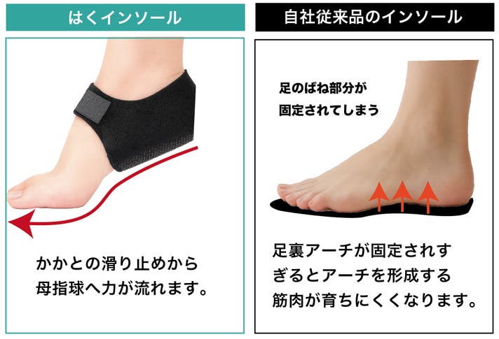 内側アーチ(=土踏まず)は姿勢保持に深く関わる部分です。そのため外部からのサポートよりも自身の筋肉でアーチを形成することが大切です。「はくインソール」は、あえて支えずに前足部を自由に動かせる“開放設計”を採用。さらに、かかとの裏に施された滑り止めゴム構造が、足をしっかりと安定させながら、母指球(足の親指のつけ根)へ自然と重心を誘導します。これにより、足のアーチが自力で支えようと働き出し、筋肉が日常動作の中で自然に使われていきます。