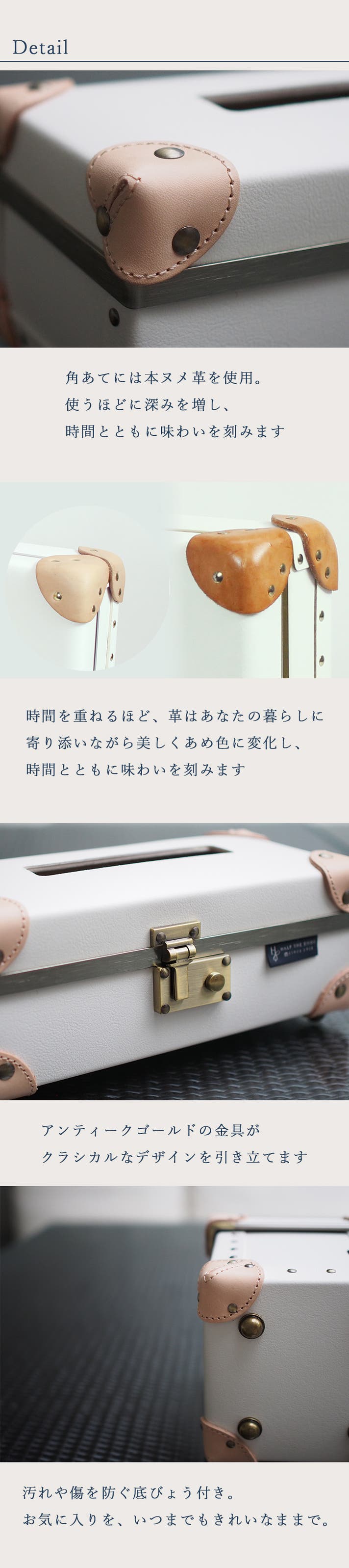 - 本ヌメ革のパーツを使用して(角部分)おり、使うほどに深みのあるアメ色へ変化し、愛着が増します!