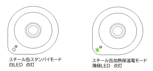 スマートスイッチを2回押すとLEDが白色に点灯し、15秒以内にスチール缶を置くと保温加熱モードに入ります。(薄緑LEDが点灯) 保温状態は設置後1.5時間持続します。(加熱保温温度45℃~55℃) *温度設定はできません。