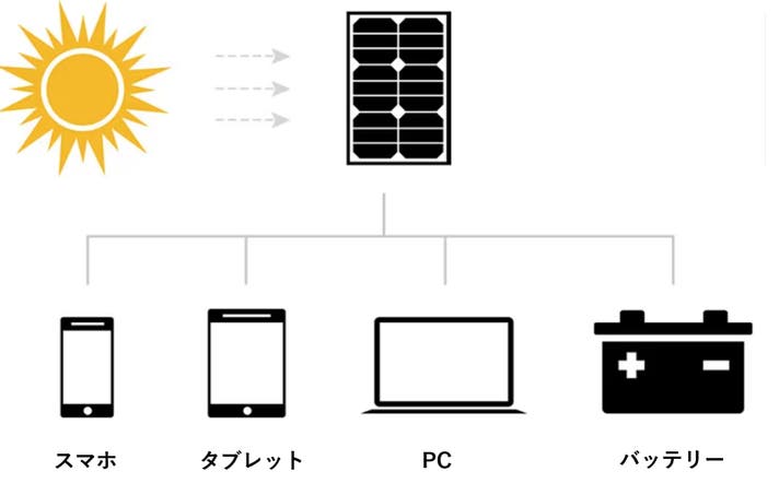 太陽光から製品にエネルギーを貯める事で様々な製品にアウトプットできます。
