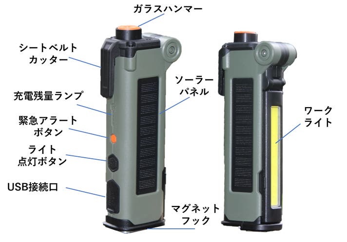 - もしもの備えはこれ1つで完結。ソーラー充電と脱出機能で、予期せぬ災害からあなたと家族を守る。
