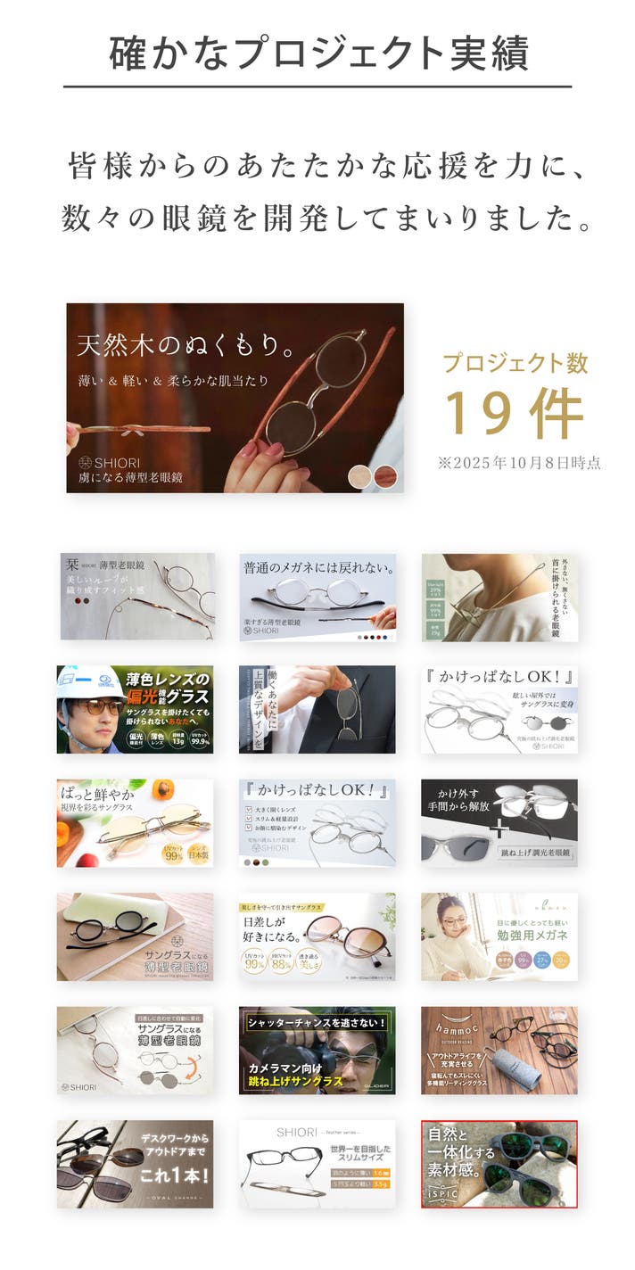 ※ご使用にあたっての使用感は、個人差がある場合がございます。 ※写真・動画などの色合いはお客様のご使用のモニターやブラウザなどの環境により、実物と多少異なる場合がございます。 ※原則として、サポーター様都合によるキャンセル・返金は承っておりません。 (サポーター様都合のキャンセル不可の例:デザインやサイズ感・使い勝手がイメージと違った、度数交換後もレンズが見えにくいなど) <対応条件> 商品の初期不良、またはお届けした商品がご注文内容と異なる場合、到着後10日以内にプロジェクトページの「実行者にメッセージ」よりご連絡ください。状況を確認の上、良品との交換対応をさせていただきます。 <良品交換対応にともなう送料(返品送料/再送料)> 実行者負担 <良品交換をお受けできないケース> ・サポーター様のお取り扱いにより破損、汚損が生じた商品 ・商品のタグ、付属品、パッケージ(箱、袋など)を紛失、破棄された商品 ・事前にご連絡をいただいていない商品 ・商品到着後、11日以上経過した商品 ・限定品や同一商品の在庫がない場合など、代替品をご用意できない商品 ※本文中に記載させていただいたスケジュールは、あくまでプロジェクト公開時点の予定です。応援購入の性質上、配送遅延のおそれがございます。 原則として、配送遅延に伴う応援購入のキャンセルはできませんが、リターン配送予定月から2ヶ月を超えた場合には、希望者に限りキャンセルにて対応させていただきます。