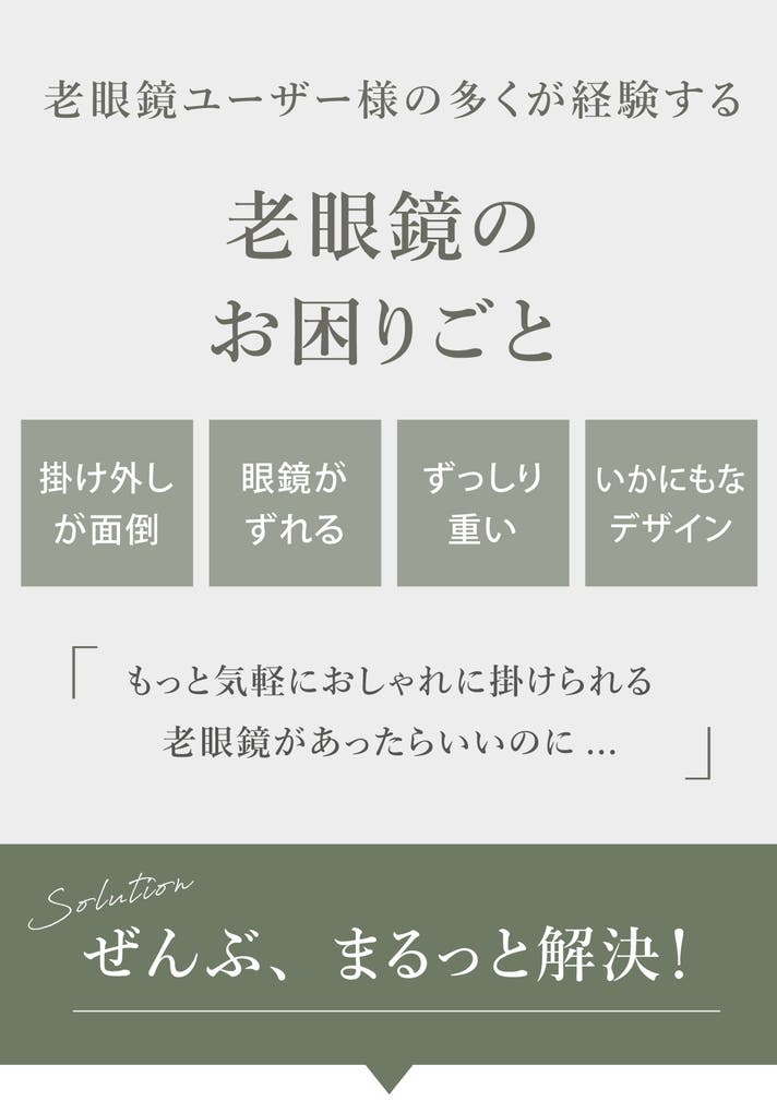掛け外しが面倒だったり、掛けているうちにズレてきたり、重かったり、似合うデザインがなかなか見つからなかったり、老眼鏡には様々なお悩みがつきものです。