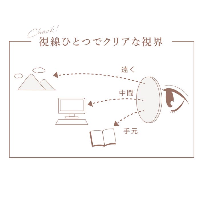 - レンズの上部になるほど度数が弱くなる累進多焦点レンズで、遠くを見るときも視界がくっきりと快適。
