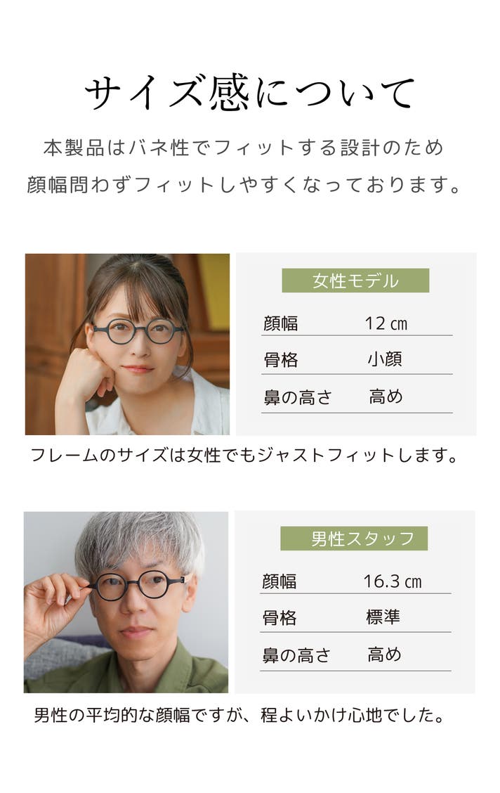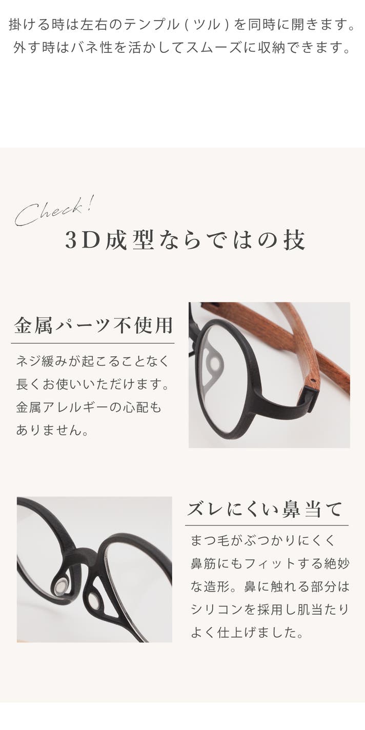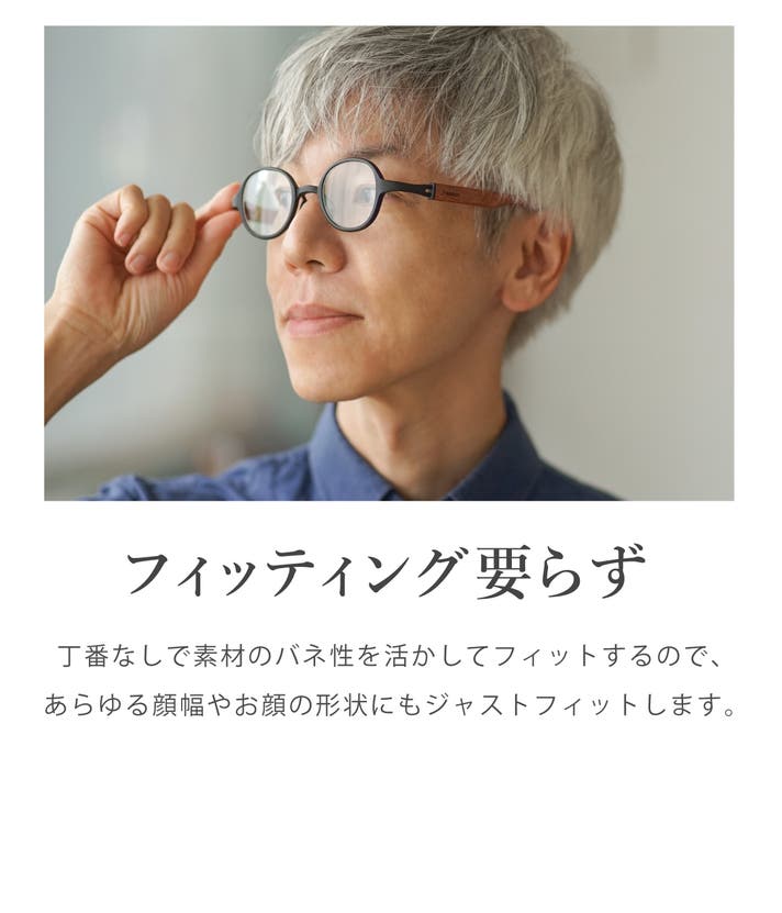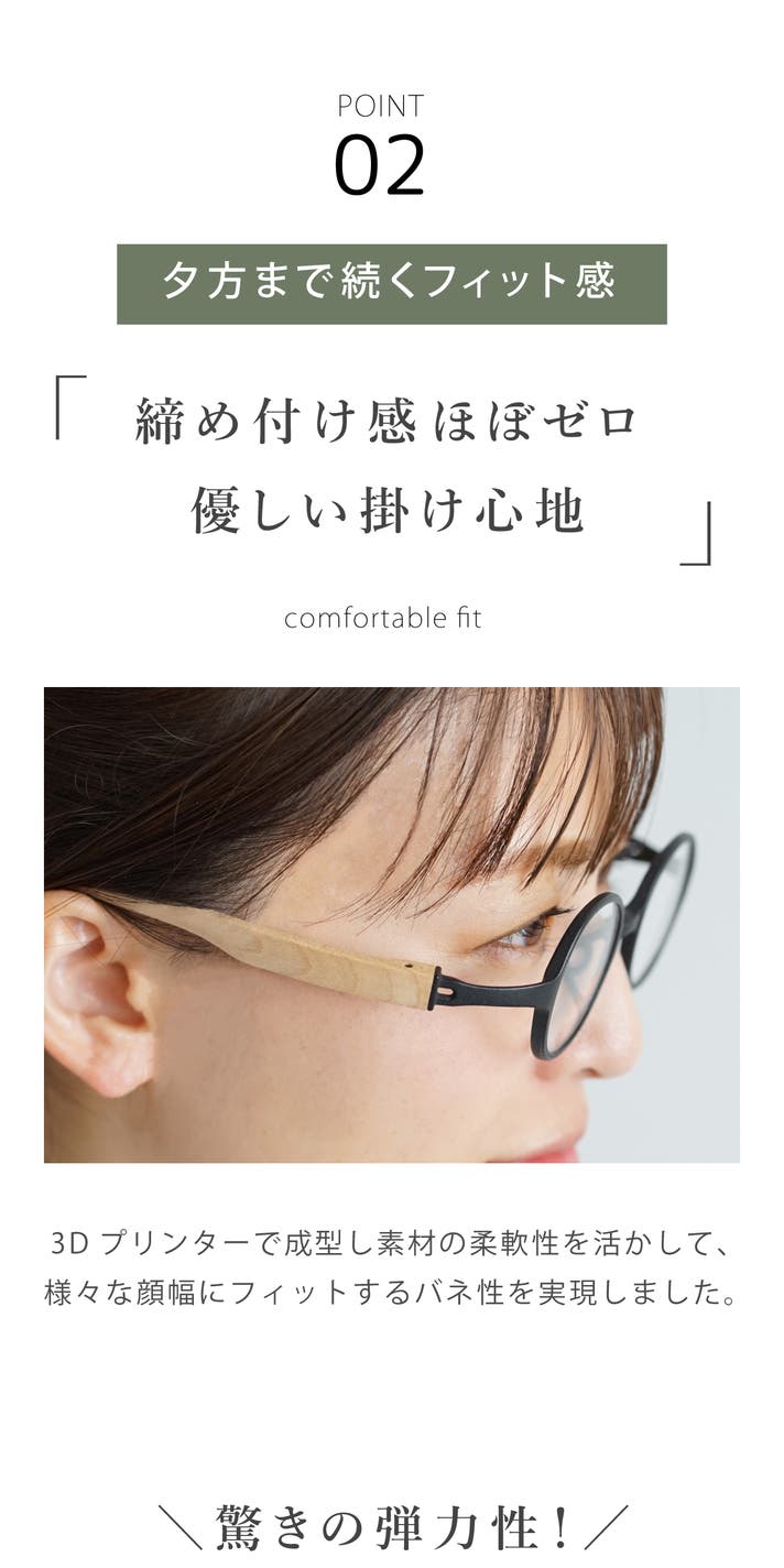 - 3D成型のフロントで軽やか&優しい掛け心地。素材のバネ性を活かして様々な顔幅にフィットします。