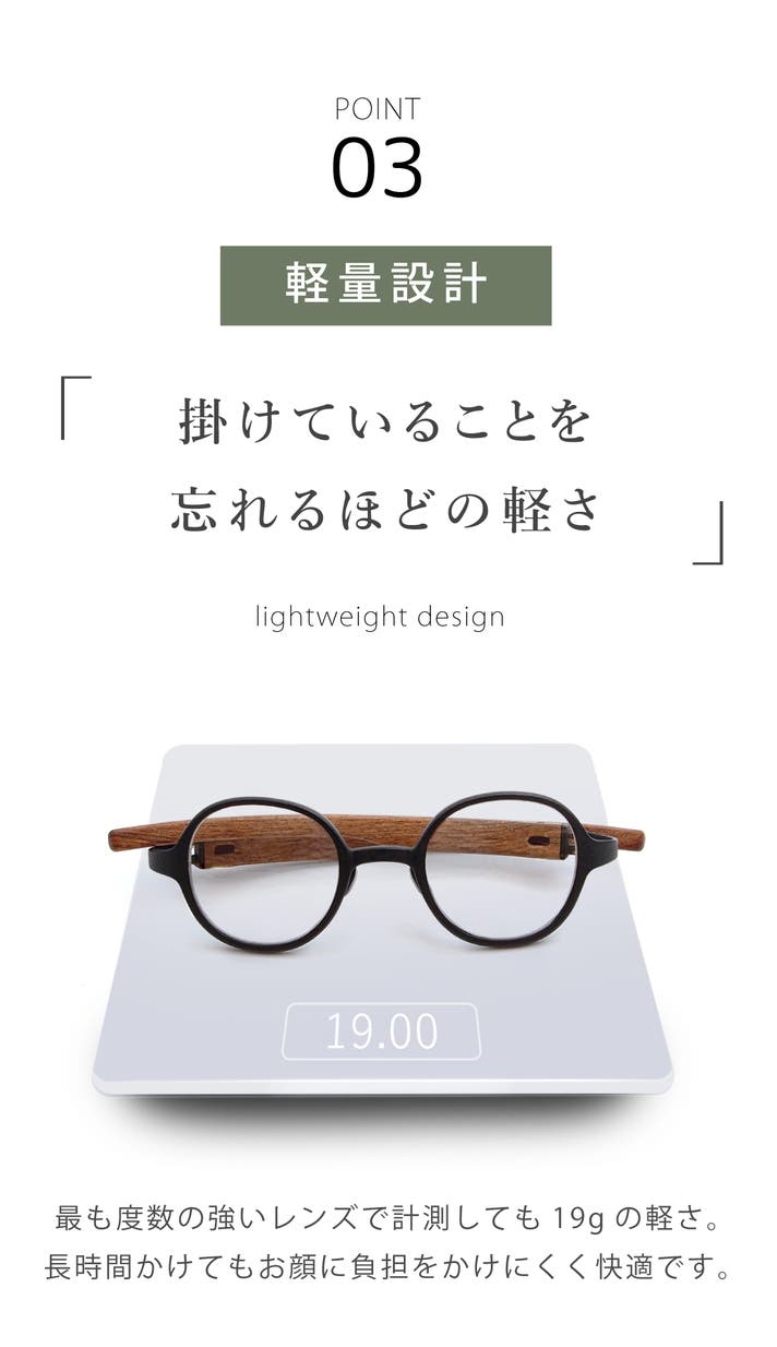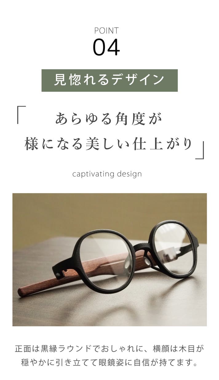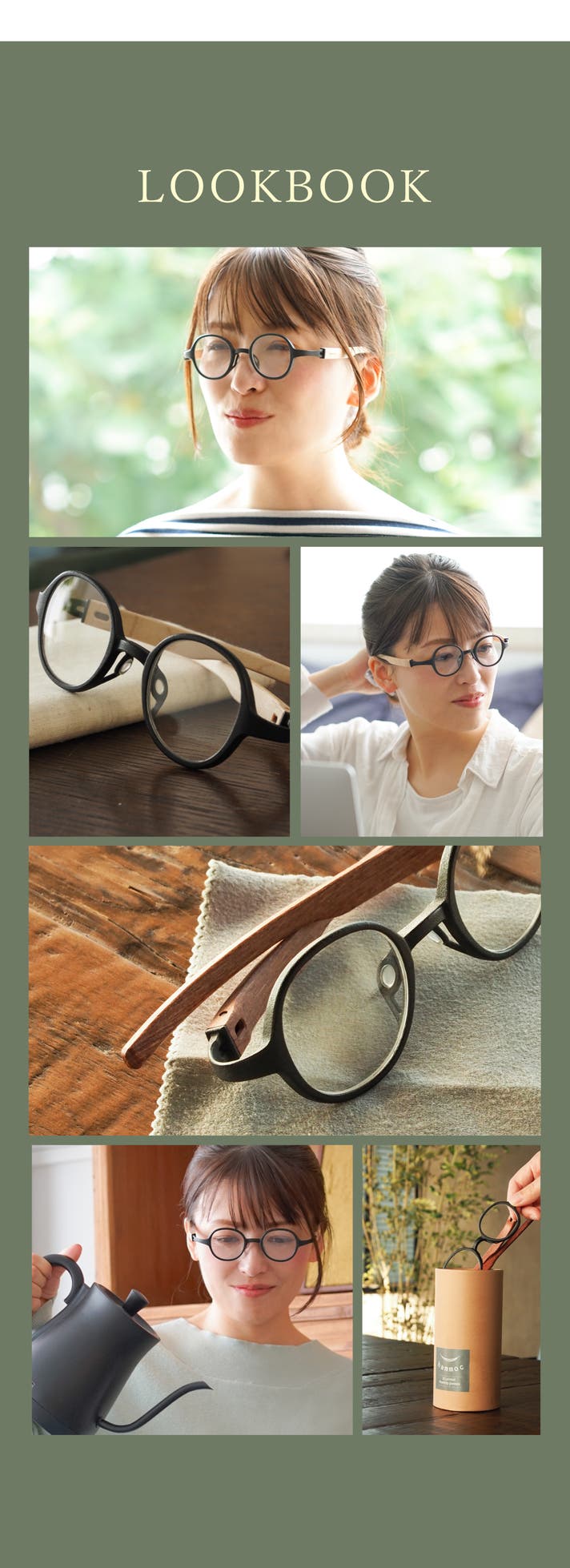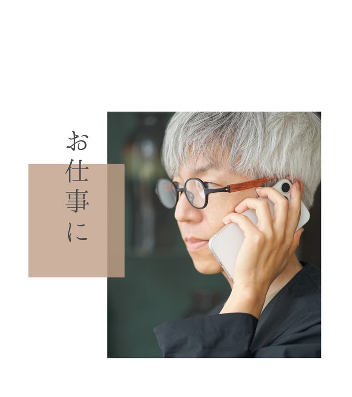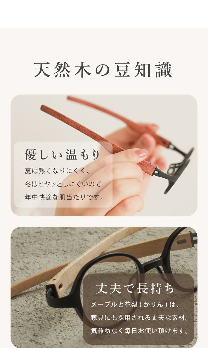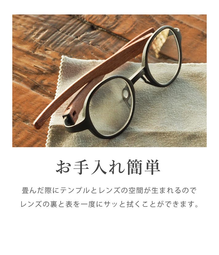 - テンプルには美しさと耐久性と軽さを併せ持つ天然木を採用。横顔をおしゃれに引き立てます。