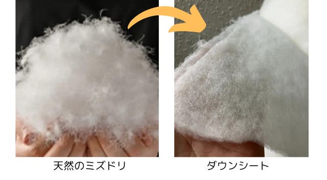 異なった素材を4層にする事によって高通気性、保温性が高くなる「SHEETDOWN」を使用。天然のミズドリに毛を使用する事により、一般の中綿より保温性がよくなります。軽い着心地、「LOTUSthermo」との2種類の中綿と合わせることで、暖かさと適度なボリュームを実現 ※特許ダウンシート