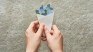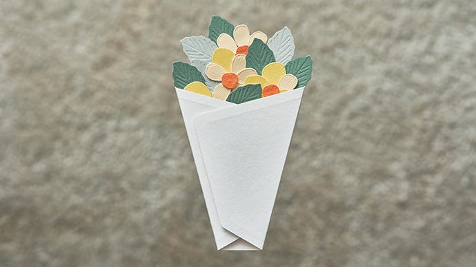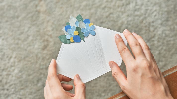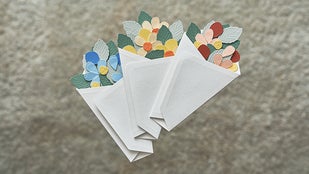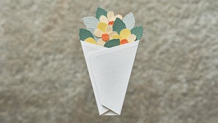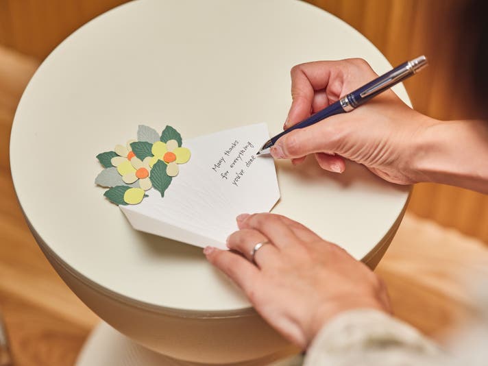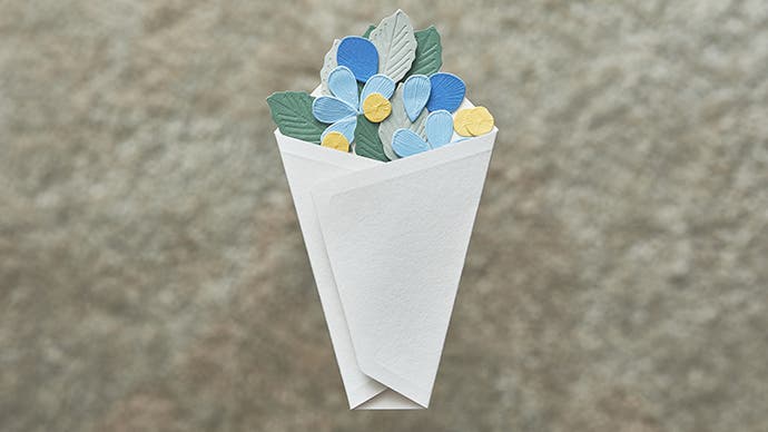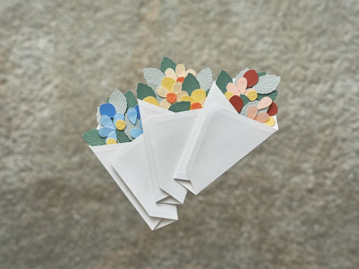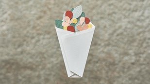 花束のデザインが決まったら、一枚一枚、台紙の上の方から重ねて貼っていくと、世界に1つだけの花束が完成します。 そして、最後に台紙の余白に一筆綴れば、メッセージカードに。