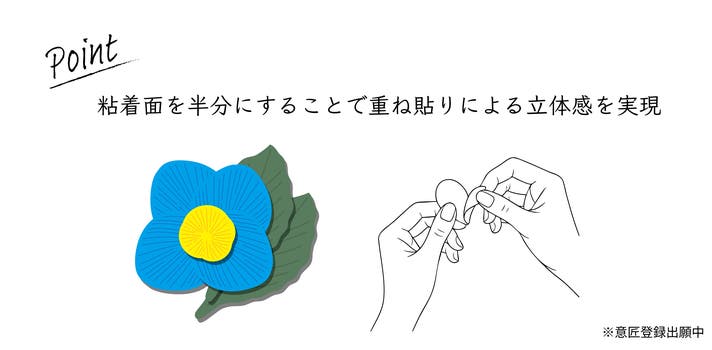 また、重ねて貼っていく楽しさをできる限り引き出すために、大きいサイズの花や葉の粘着面はあえて半分だけに。貼り重ねても厚みが出すぎず、軽やかにレイアウトできるよう設計しました。