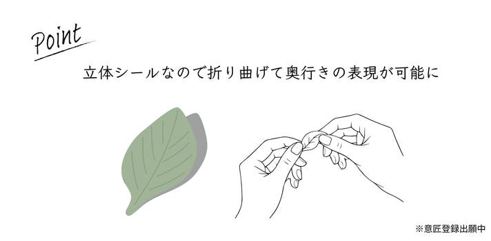 シールは開発したシール技術を活用し、ぷっくりとした厚みがあり、花のしわや葉脈をイメージした凹凸が型押しされています。