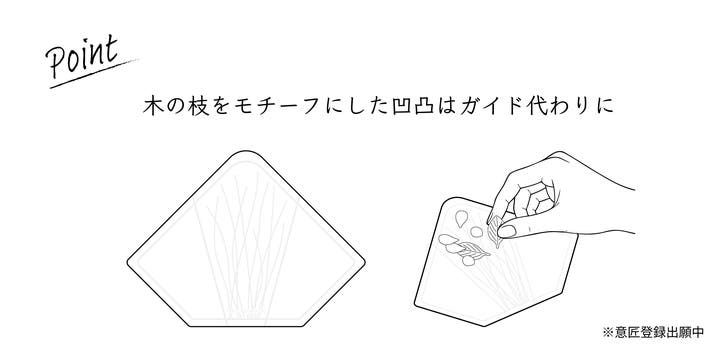 台紙をよく見ると、凹凸の線が入っています。これは枝をモチーフとしているだけでなく、実際にレイアウトを考えていく際のガイドでもあります。一見シンプルな見た目の中に、実は小さな工夫やこだわりが散りばめています。