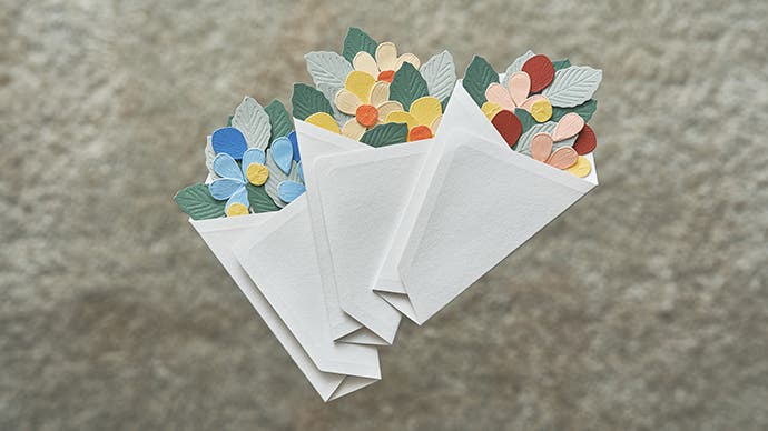 素材にもひと工夫。ベースとなるシールの材質は、マットで温かみのある和紙を使用しています。また、通常のシールよりも肉厚な多層構造になっているため、軽く折り曲げて立体的に貼ることも可能です。例えば、花びらの先を少し起こすと、光を受けて陰影がふわりと変化し、ブーケの奥行きを感じられます。