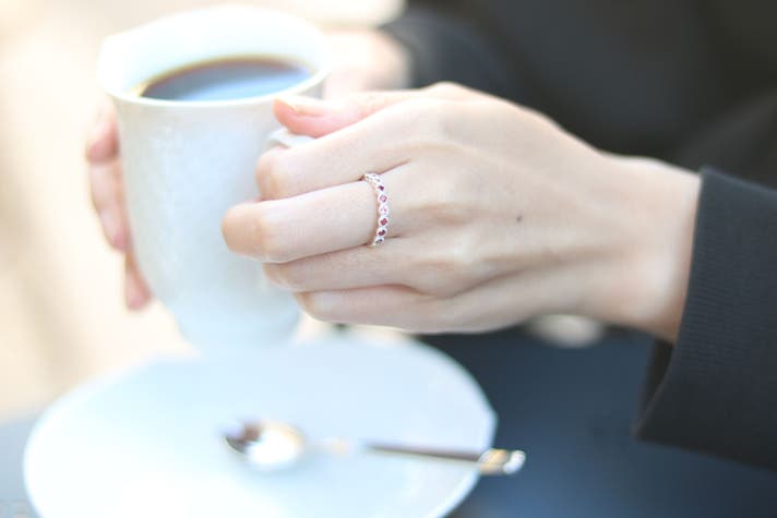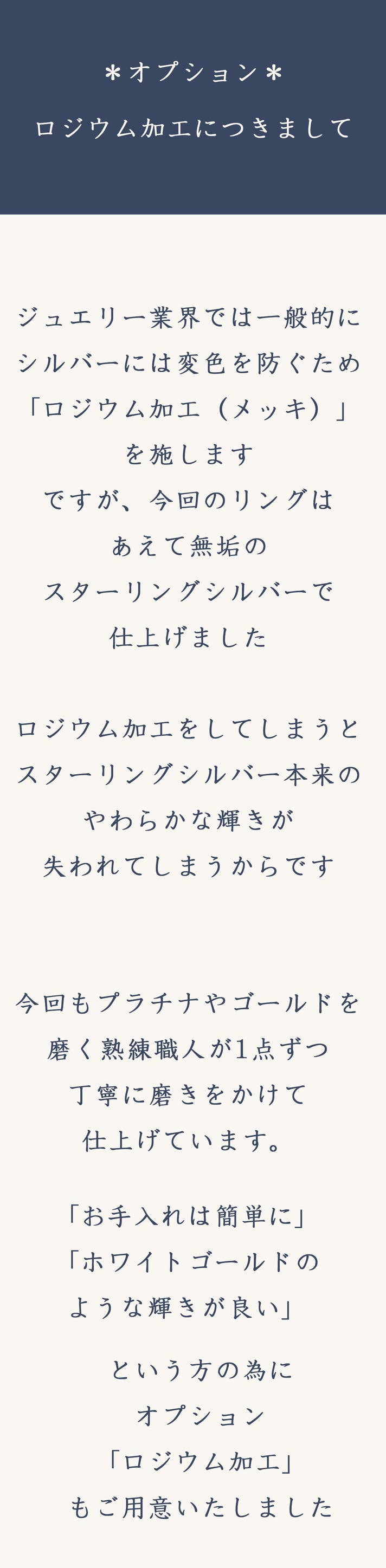 応援購入購入頂きましたリングはスターリングシルバー本来の美しさをお楽しみ頂くため、ロジウム加工を施しておりません。出来る限り変色させたくない。「ホワイトゴールドのような煌めきが良い」という方はオプションのロジウム加工をお選びください
