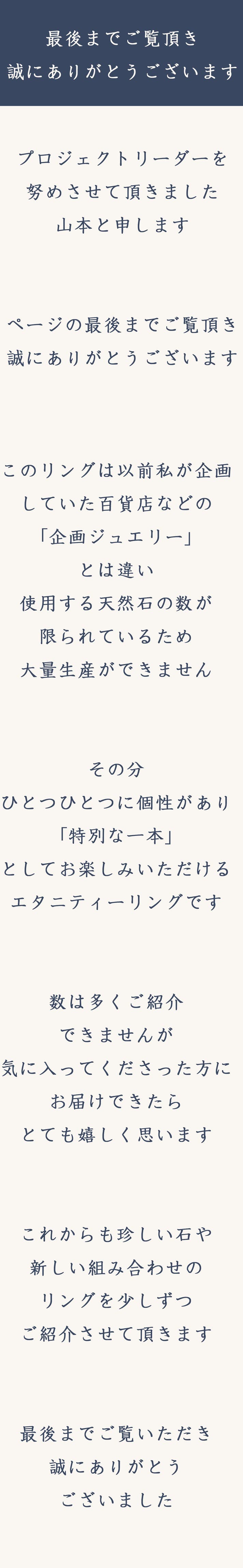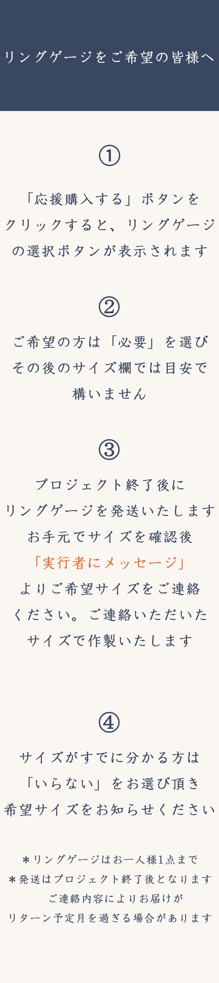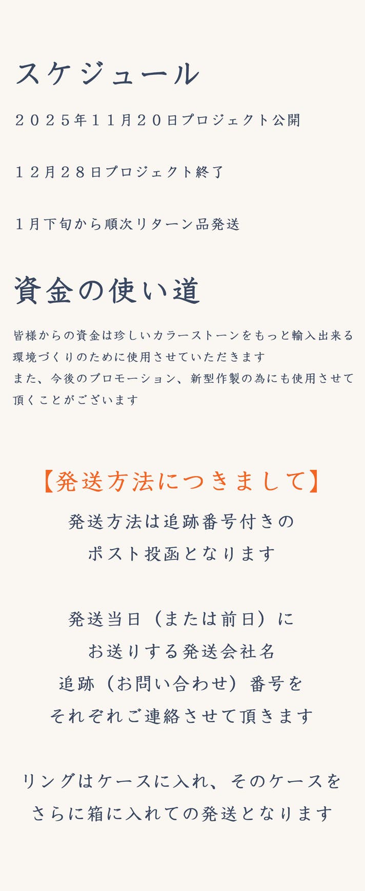 今回のリスク&チャレンジ *使用間、サイズ感等に関する返品、返金はお受け致しかねます。 *ジュエリーは手作りの部分が多くございます。表記サイズよりも若干の誤差があることがございます。 *スターリングシルバーを使用いたしておりますが、痒みや痛みなどの症状が出た場合はご使用を 中止してください。 *プロジェクト終了後、為替の変動により、プロジェクトの販売価格より下がる場合もございます。 *天然石を使用しております。それぞれに石の個性があり、写真と少し異なって見えたり、 写真より内包物が多くあることがございます。ご了承ください。 ※使用感等に関する返品・返金はお受けいたしかねます。 ※開発中の製品につきましては、デザイン・仕様が一部変更になる可能性もございます。 ※応援購入の数が想定を上回った場合、製造工程上の都合等により出荷時期が遅れる場合がございます。 配送に遅れが生じる可能性が判明した場合、直ちにご報告させていただきます。 ※本プロジェクトを通して想定を上回る皆様から応援購入頂き、現在進めている環境から量産体制を更に整え ることができた場合、正規販売価格が販売予定価格より下がる可能性もございます。 ※本プロジェクトの実施において十分確認は行なっておりますが、類似品が発覚する可能性がある点、ご了承願います。 【商品等の不具合による返品・交換】 原則として、サポーター都合によるキャンセル・返金は承っておりません。 (サポーター都合のキャンセル不可の例:誤注文、長期不在) ◾️対応条件: 商品の初期不良、またはお届けした商品がご注文内容と異なる場合、到着後14日以内にプロジェクトページの「実行者にメッセージ」よりご連絡ください。状況を確認の上、修理対応、または良品との交換対応をさせていただきます。 ◾️送料/再送料: 実行者負担 【返品・交換をお受けできない商品】 ・サポーターの責任により破損、汚損が生じた商品 ・商品のパッケージ(箱、袋など)を紛失、破棄された商品 ・事前にご連絡をいただいていない商品 ・商品到着後、15日以上経過した商品 本文中に記載させていただいたスケジュールは、あくまでプロジェクト公開時点の予定です。応援購入の性質上、配送遅延のおそれがございます。 原則として、配送遅延に伴う応援購入のキャンセルはできませんが、リターン配送予定月から2ヵ月を超えた場合には、希望者に限りキャンセルにて対応させていただきます。 応援購入サービスの性質上、以上の注意点につきましてあらかじめご理解とご了承いただいた上で応援購入くださいますよう、よろしくお願い申し上げます。
