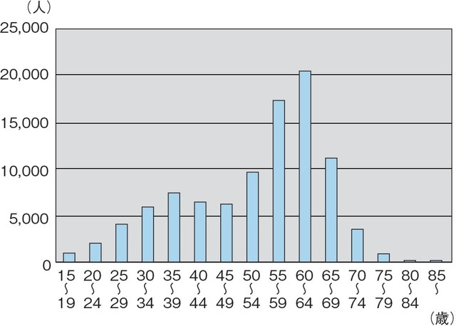 (2010年 厚生労働省 左官職人年齢別グラフ)