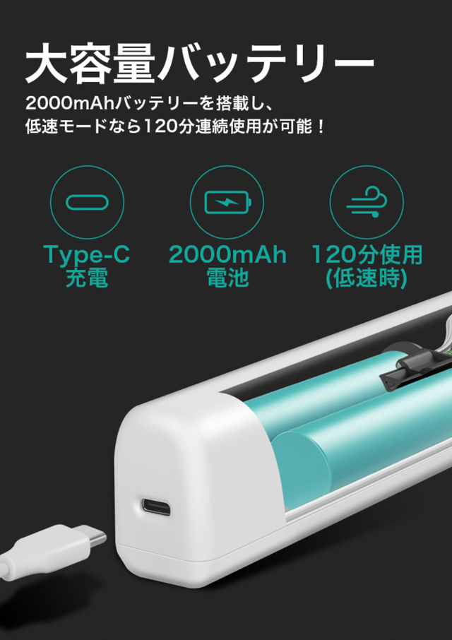 - IPX7防水でさらに幅広い使用シーン!大容量バッテリー搭載で低速モード120分連続使用!
