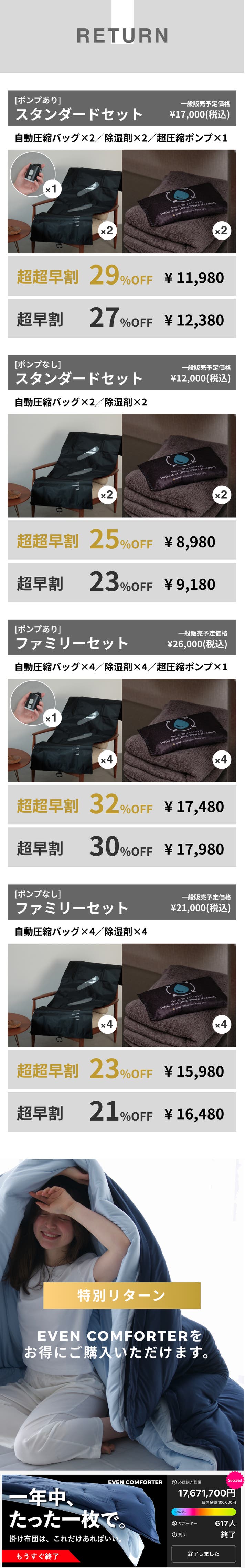 ※ このリターンはオプションです。自動圧縮バッグをお求めの際は「○○早割」と記載のあるリターンをお買い求めください。