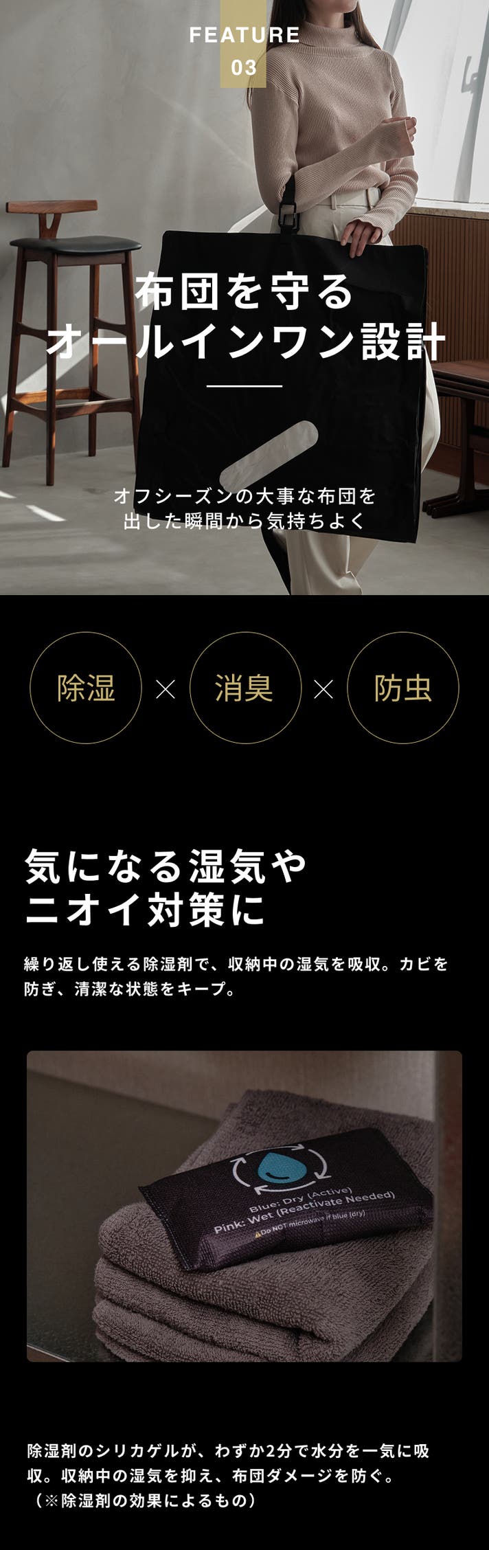 - 【除湿・消臭・防虫】布団を使うときまで気持ちよく。繰り返し使える除湿剤で大事な布団を守る。