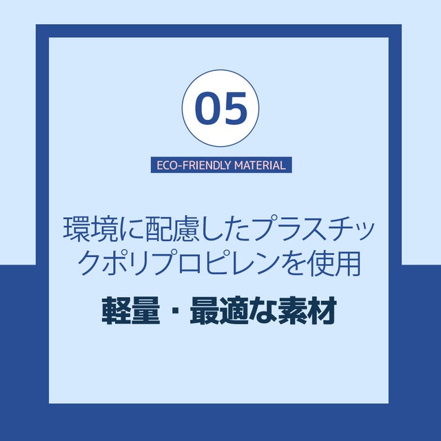 A.よく知られているPP素材ポリカーボネート(polycarbonates)は、プラスチックの中で、絶縁性、耐久性、柔軟性、非毒性の衛生性に優れた素材です。この理由から、食品容器以外にも色々なところに使われています。ただ単に外観をきれいにデザインした商品を作るためだけでなく、安全に長く使っていただきたいと思い、PPプラスチックを採用しました。